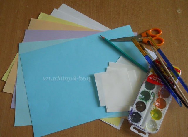 Матеріали: кольоровий папір - для фону; білий папір, фарби акварельні, пензлі, ножиці; клей