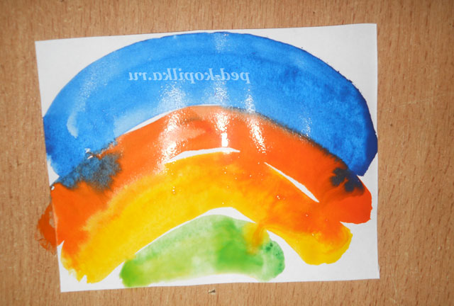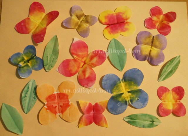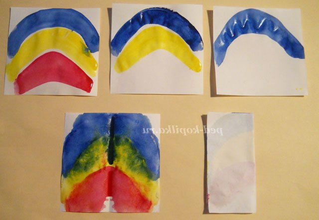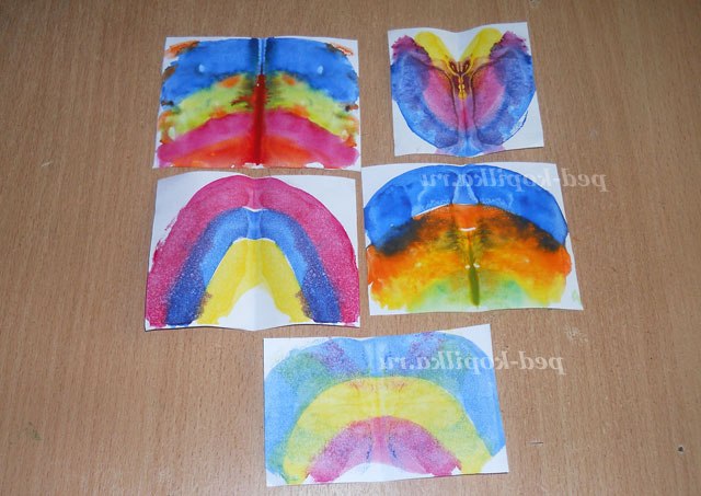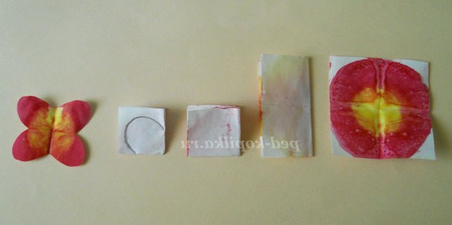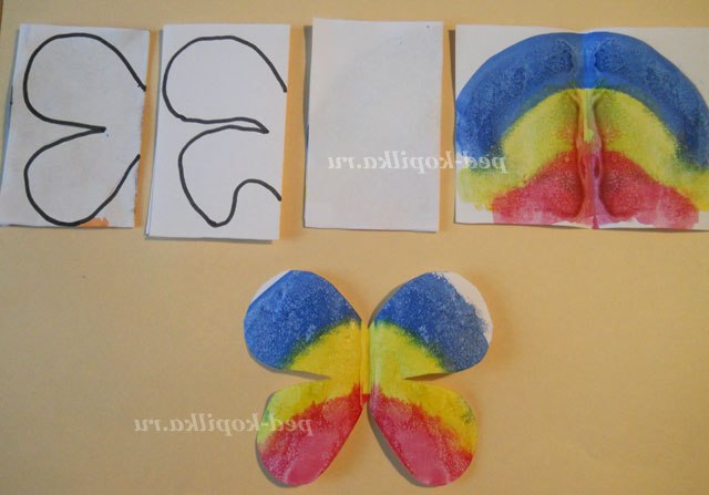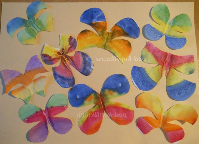Тепер приступимо до виготовлення метеликів. Для цього нам потрібні білі квадрати (можна прямокутники) і фарби яскравих кольорів (адже метелики бувають яскраві). Малюємо на наших заготовках ніби веселку.