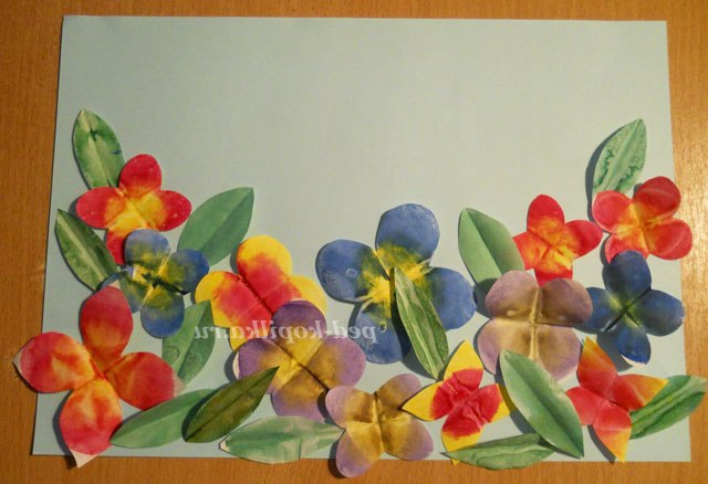 Вибираємо фон для нашої галявини і розкладаємо на ньому заготовки листочків і квітів. Тепер їх потрібно приклеїти, тільки змащувати будемо середину квітів і листочків. Це потрібно для того, щоб робота вийшла об'ємною, опуклою.