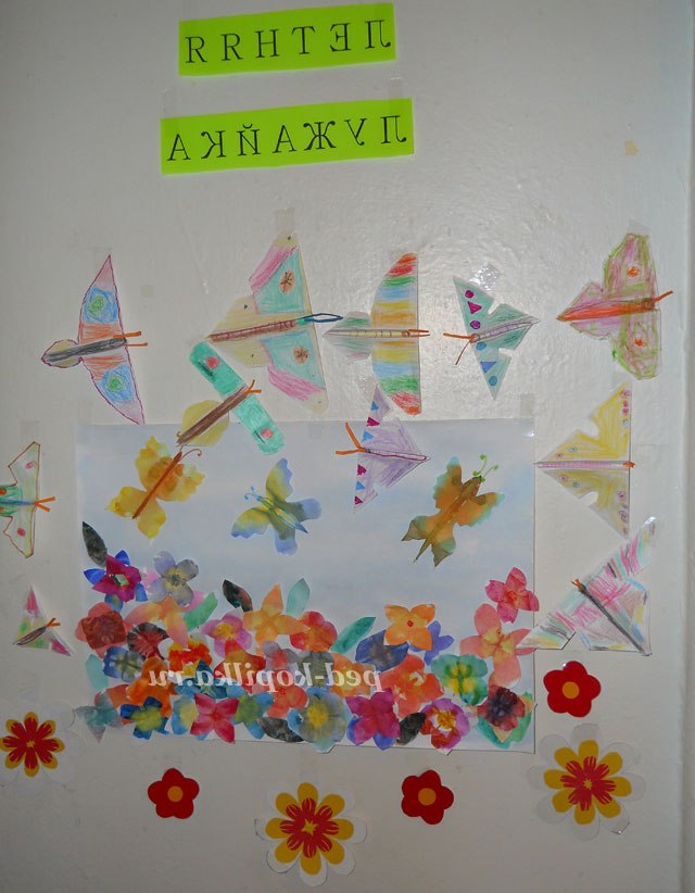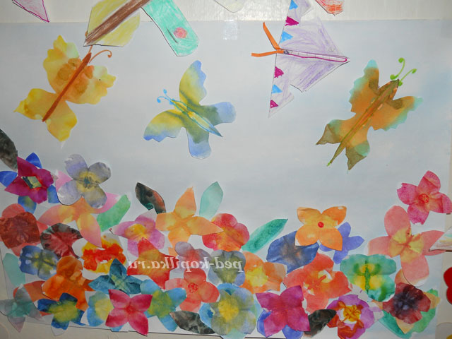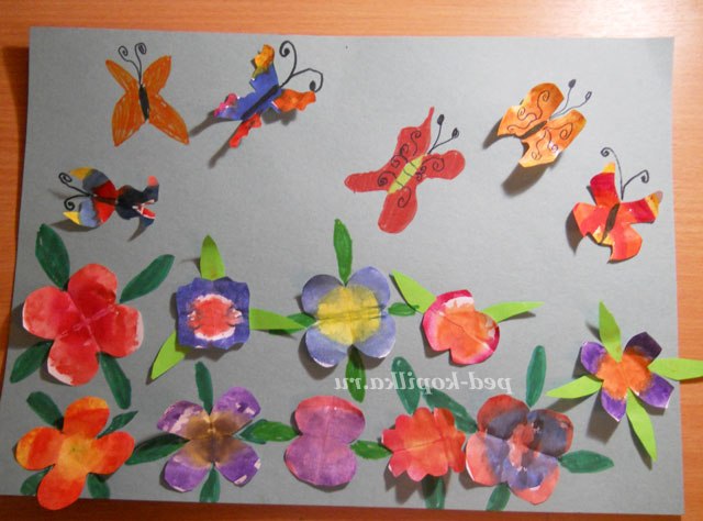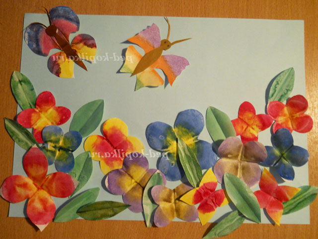Залишилося приклеїти метеликів, що пурхають над квіточками ( приклеювати теж за серединку). Приклеюємо (або подрисовываем) метеликам тільце, очі (а якщо захочеться то можна крильця прикрасити блискітками - щоб вони були яскравіше).