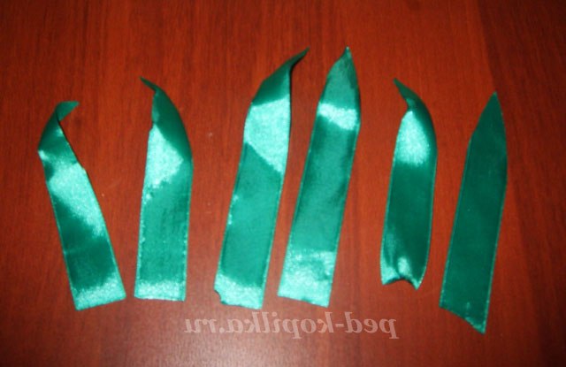 Вирізаємо смужки із зеленої атласної стрічки і кінці стрічки трикутної форми. Обробляємо сірниками, щоб не обсипалися.