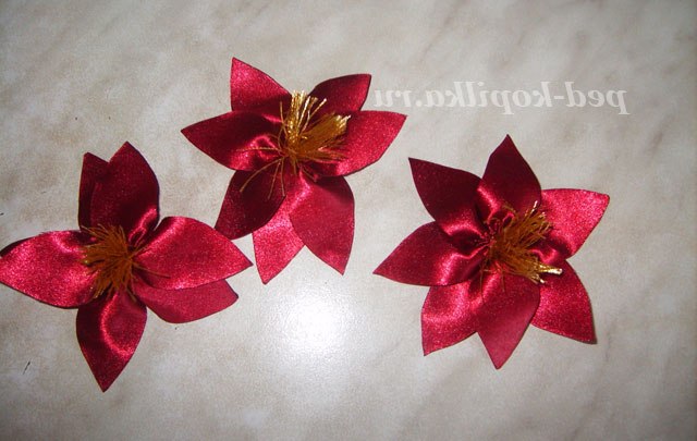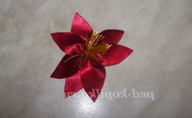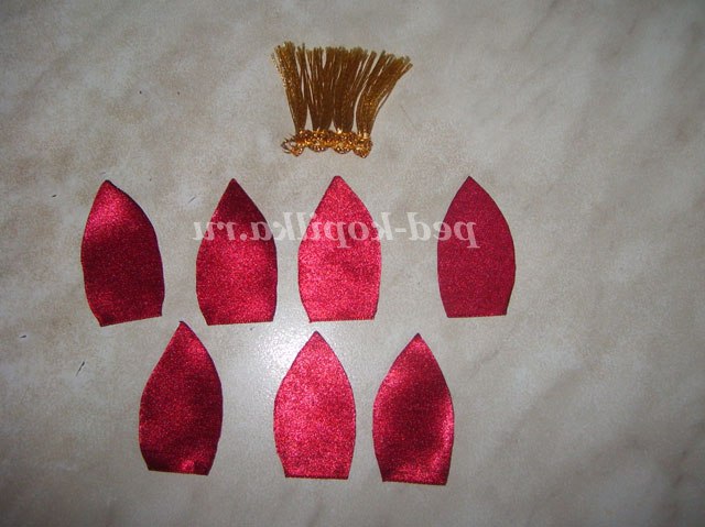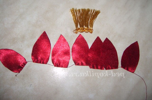 Беремо бордову атласну стрічку і вирізаємо сім пелюсток