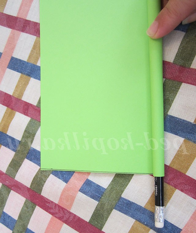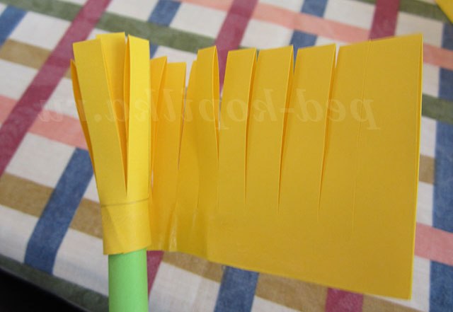 Починаємо виготовляти стебло квітки. Від аркуша зеленого паперу відрізаємо 10 см.Этот маленький шматочок знадобиться нам потім для листочків. А з більшої частини робимо стебло: накручуємо лист на олівець і підклеюємо кінчики папери.