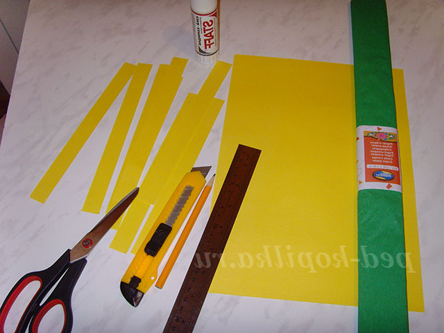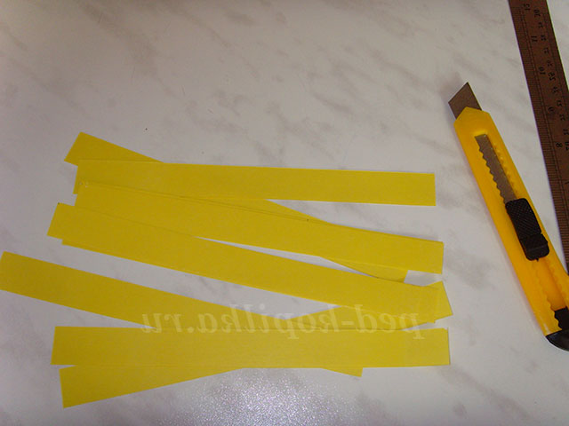 1. Нам знадобляться смужки 15 або 20 мм. Розмічаємо лист жовтої офісного паперу по короткому краю. Олівцем робимо позначки на потрібну ширину. За допомогою залізної лінійки і канцелярського ножа ріжемо на смужки. Якщо ніж гострий, можна різати 2-3 аркуша одночасно.