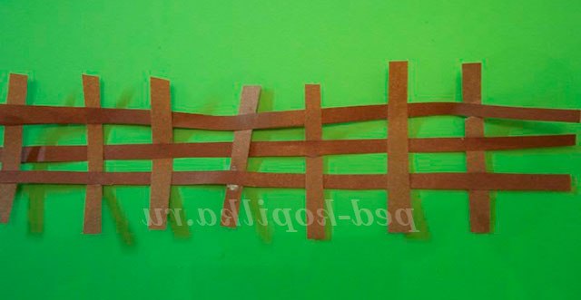 7. Паркан виконуємо зі смужок коричневого кольору, використовуючи плетіння .