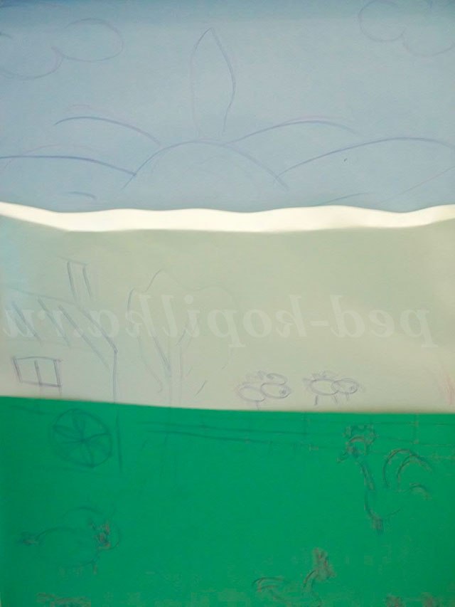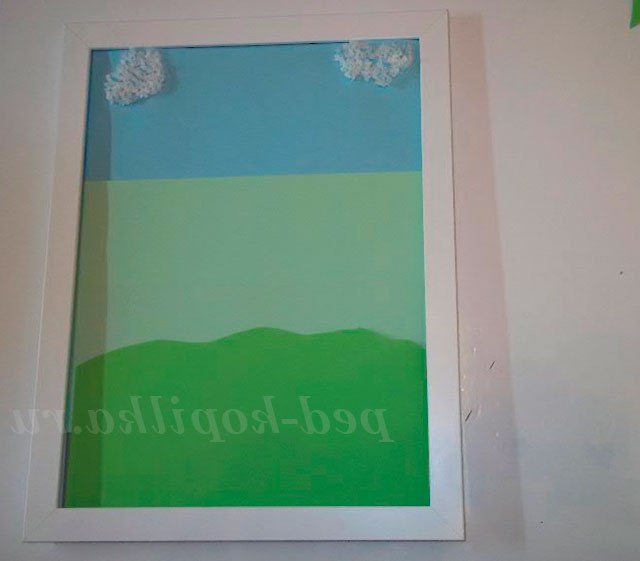 1. Підстави Для картини беремо картон, на ньому маємо послідовно зверху вниз, блакитний лист, світло-зелений, зелений.