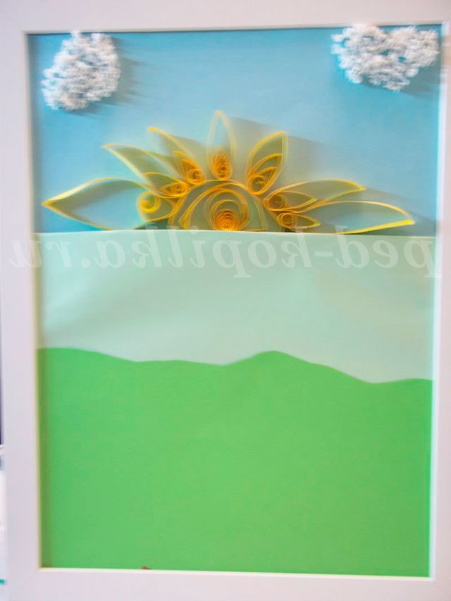 5. Зі смужок 7 мм скручуємо елемент «вільна спіраль». Надаємо форму «півколо», Навколо півкола, викладаємо промінчики. У формі «вільна спіраль» надаючи форму «крапельки» вийшло сонечко.