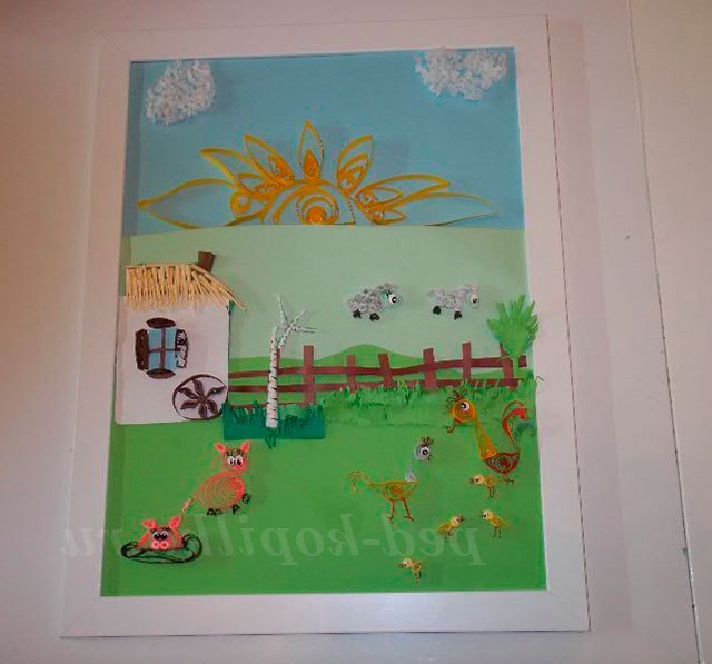 - смужок для квілінгу білого кольору для овечок, для зеленого листя берези, червоні смужки для півника, жовті для сонечка-7мм. Коричнева смужка для корови, жовті для дахи будинку, коричневі різних відтінків для забору жовті для курчат, рожеві для поросят -