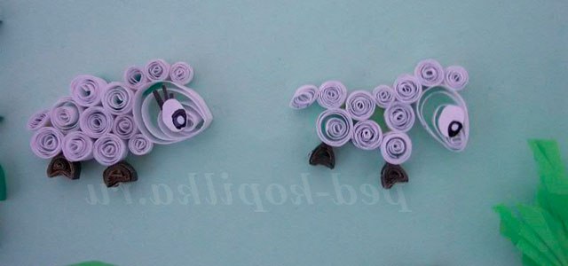 6. Накручуємо елементи «туга спіраль» за допомогою зубочистки білого кольору і викладаємо баранчика. Голову робимо з елемента «вільна спіраль», ніжки з елемента «півколо» коричневого кольору. Оченята малюємо.