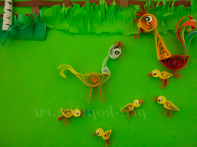 13. Курчата виконані: головка з елемента «туга спіраль» і тулуб елемент «крапелька», дзьобик і ніжки з червоних смужок.