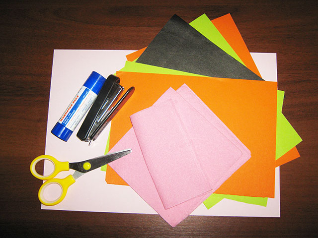 Матеріал: кольоровий папір (чорна, зелена, помаранчева - обов'язково, для фону листівки папір будь-якого кольору), серветки червоного або рожевого кольору, ножиці, клей-олівець, степлер.