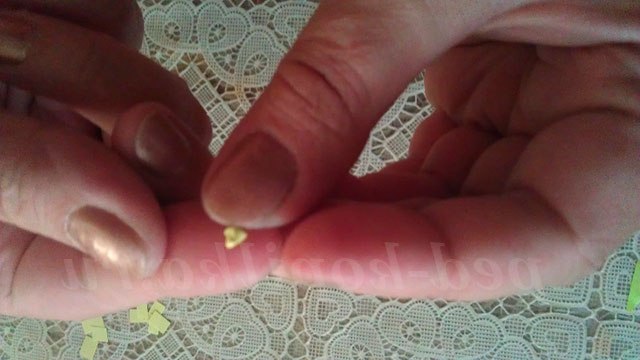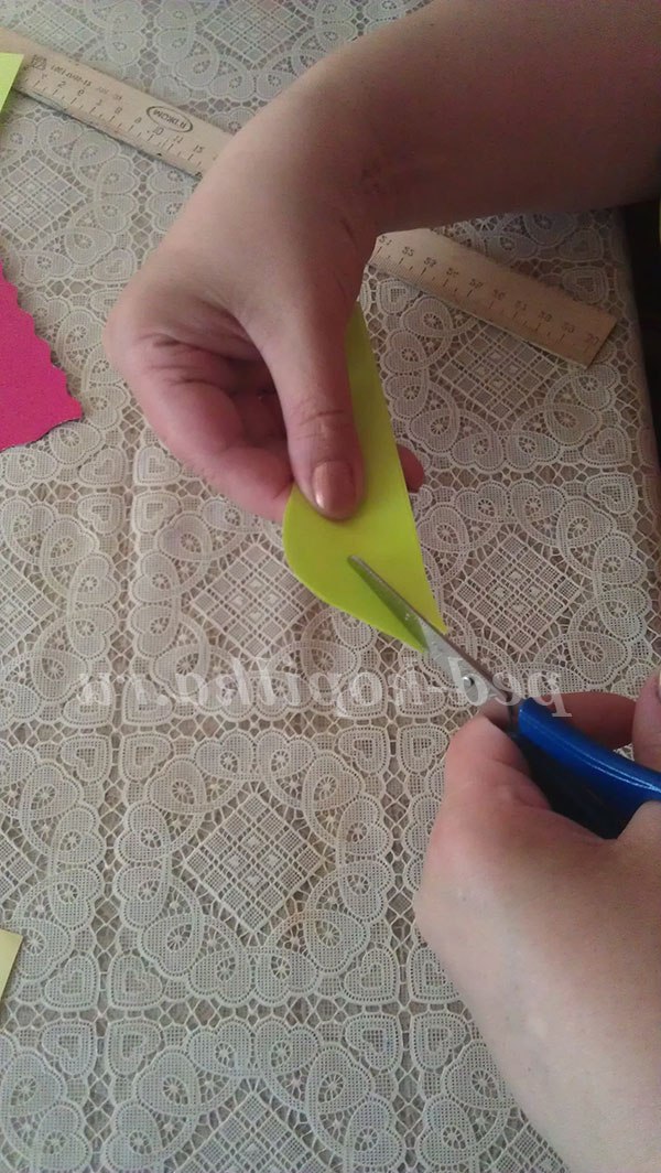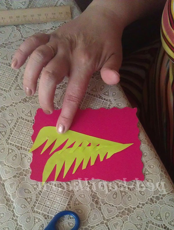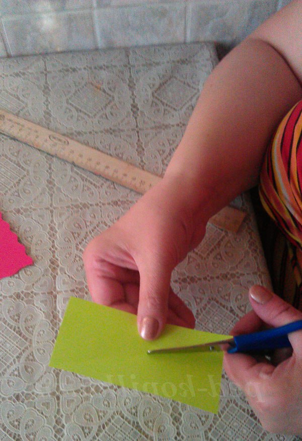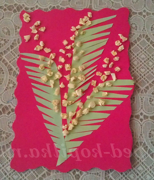 1. З зеленого паперу або напівкартону вирізаємо гілку. Для цього паперовий прямокутник розрізаємо по діагоналі на два трикутники. Потім поєднуємо обидва трикутника. Заокруглюємо лівий верхній кут. По діагоналі, починаючи з верхнього кута, вирізаємо довгі «вовчі зуби». Це і будуть гілочки для нашої мімози.