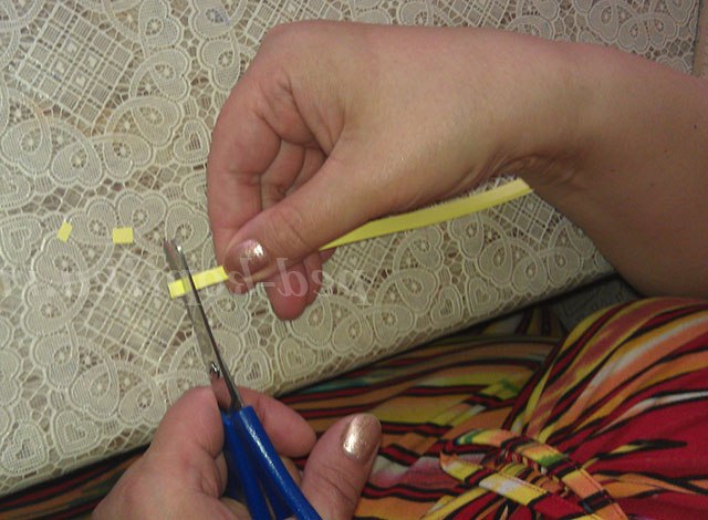 2. З жовтого паперу нарізаємо на невеликі шматочки, скачуємо їх в тугі клубочки.