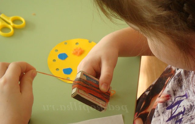 Для створення веснянки необхідні: вовняні нитки, картон жовтого кольору, кольоровий папір, клей олівець, ножиці,сірникову коробку.