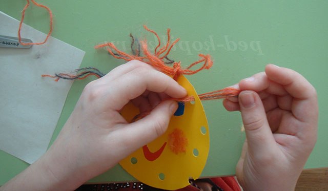 8. Протягуємо вовняну нитку послідовно через всі отвори; зав'язуємо вузлики.