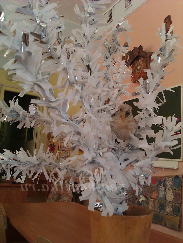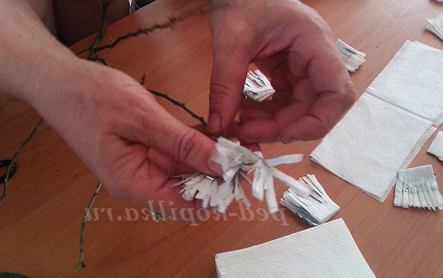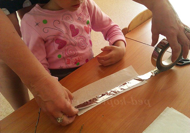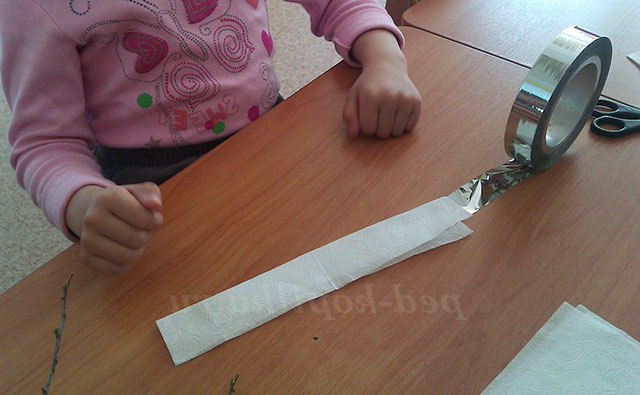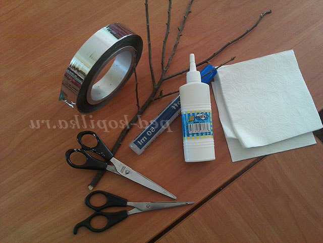 Необхідний матеріал: гілка з розгалуженими кінцями; серветки або тонкий папір; фольга срібляста; ножиці; клей.