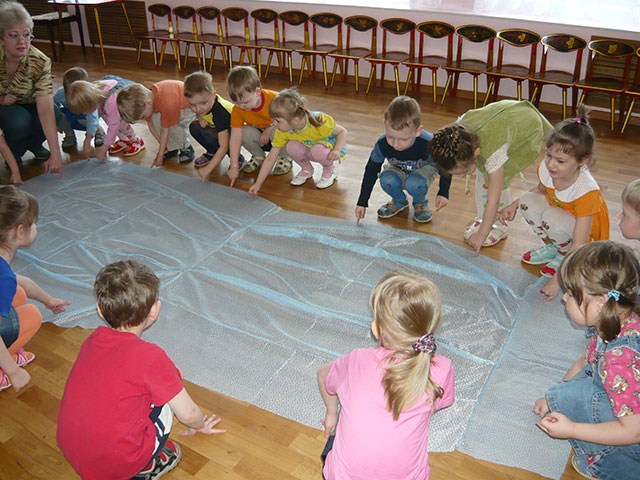 Вихователь: Хлопці, скажіть яка зараз пора року? (Весна). Правильно, весняне сонечко все більше припікає, нас в зал зазиває. Гріє сонечко все навколо і ось вже сніг тане. А що буває, коли тане сніг? Правильно, з'являються маленькі калюжі і великі калюжі. Ой, подивіться, яка велика калюжа розлилася перед нами (в центрі залу «калюжа» - блакитна тканина).