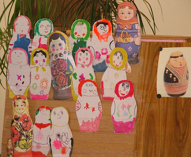 Діти: розміщують свої вироби на стенді поряд з Матрьошкою з певним видом розпису, називають своїх Матрьошок іменами ( Глаша, Варвара, Матрона, Марфа, Пелагея, Анастасія, Мар'яна, Уляна, Дуняша).