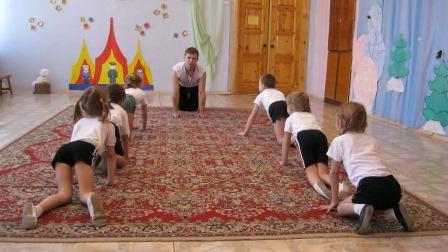 Вправляти дітей у повзання по гімнастичній лаві на четвереньках з обтяжливим предметом.