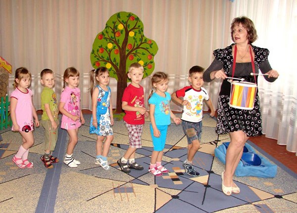 Звучить «Марш дерев'яних солдатиків П.І. Чайковського. Музичний керівник відстукували на барабані ритм музики. Діти крокують по колу. У середній частині маршу отстукивают ритм пальчиками, потім імітують гру на трубі.