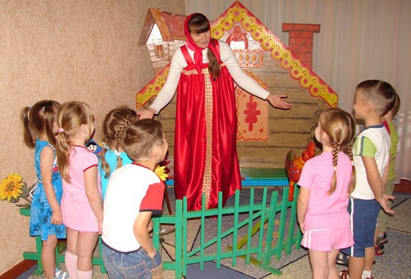 Ігровий матеріал: будиночок, іграшки Заєць і Півник, куб, на гранях якого зображені різні тварини, куб із зображенням музичних інструментів, музичні інструменти (бубон, сопілка, барабан, брязкальце, дзвіночок, металофон), таз з водою, матрьошки в різних сарафанах (клаптикові ляльки, надягають на руку), площинне дерево, будиночок тіточки Матреши.