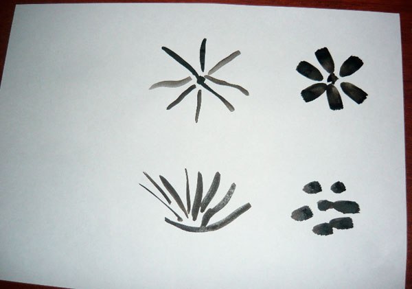 Педагог показує кілька прийомів малювання пелюсток: всією кистю, кінцем, примакиванием.