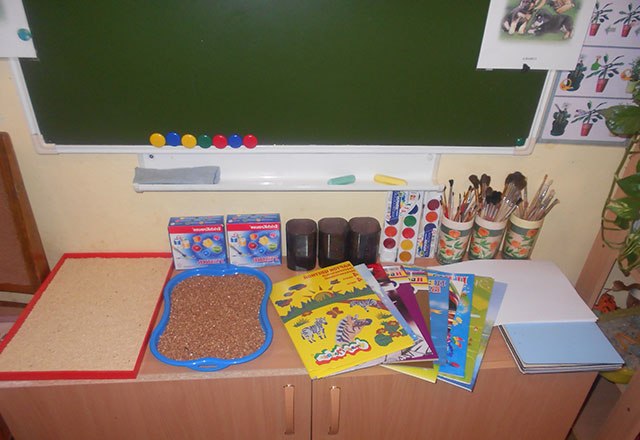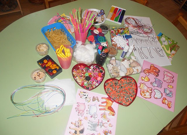 Роздатковий матеріал: крупа, макаронні вироби, бісер, ґудзики, квасоля, клей - олівець, пензлі, підставки, клейонки, серветки, шматочки тканини, вушні палички, вата, одноразові тарілки, саморобні фігурки домашніх тварин, розмальовки із зображенням квітів, домашніх тварин і птахів, магніти, набори домашніх тварин і птахів, наклейки, ножиці, кольоровий папір, фломастери, кольорові олівці, воскові крейди, різнокольорові кулькові ручки, шнурки - плетінки, об'ємні наклейки із зображенням комах, гуаш, акварель, пластилін, дощечки для роботи, стеки, солоне тісто, трафарети, формочки для тіста, настільні мозаїки, лічильні палички, нитки, білизняні прищіпки, набір геометричних фігур на липучках, фланелеграф, кришки з-під пляшок, ковпачки фломастерів, палички Къюзенера, блоки Дьеныша, конструктор пластмасовий, дерев'яний, м'який - різних розмірів і форм, футляри з кіндер - сюрпризів, коктельні палички.
