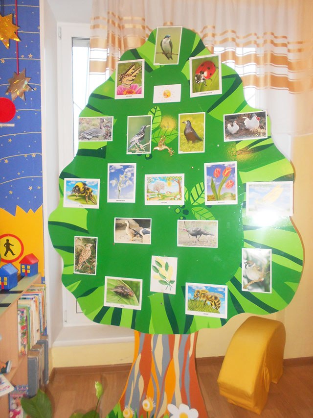 Демонстраційний матеріал : художня майстерня; театральна міні - студія; макет дерева; фігури та іграшки домашніх тварин і птахів; дидактичні зображення птахів, квітів, домашніх тварин; виставка дитячих робіт художньої творчості; деталізоване зображення фрагмента російської хати - з використанням самовара і сільської домашнього начиння.