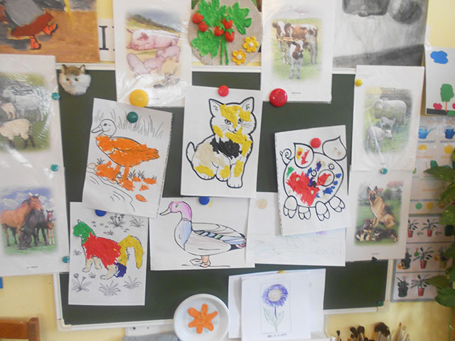 8. «Свійські тварини і птахи» - виготовляють, використовуючи пряжу, пластилін, ґудзики, камінці дрібні, вату, серветки паперові, клей. З допомогою магніту закріплюють свої роботи на дошці (кінь, свиня, корова, кішка, собака, гусак, качка, курка, півень).