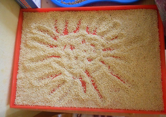 13. «Диво - картина» - нетрадиційний спосіб малювання - малюють пальчиком по крупі (пшоно, гречка, рис): сонечко, квітка, портрет бабусі і т.д., тим самим розвиваючи дрібну моторику.