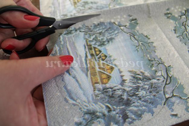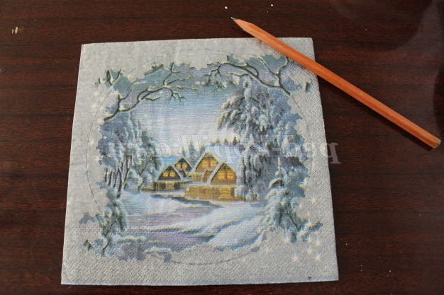 За допомогою пензлика та клею ПВА обережно приклеюємо верхній шар серветки (серветки для декупажу тришарові, нам потрібен тільки верхній шар).