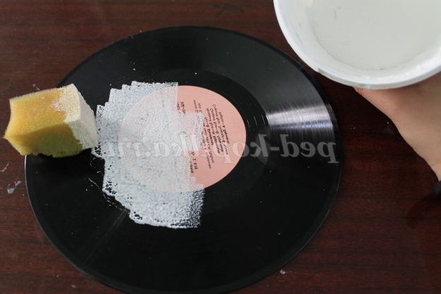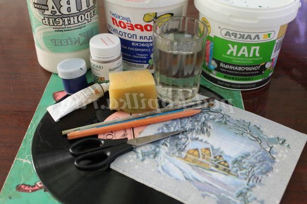 Нам буде потрібно: платівка, серветка для декупажу, ножиці, простий олівець, пензлик щетина, пензлик білка, поролон, склянку води, кракелюрний лак, акрилова фарба, фарба водоемульсійна фарба для стель, клей ПВА, лак акриловий.