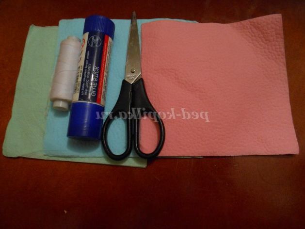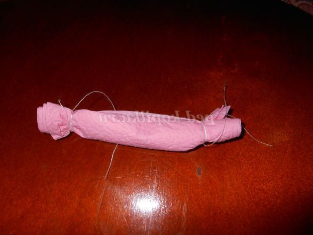 6.Скручиваем рожеву серветку валиком кінці зав'язуємо у вигляді цукерки - це руки.