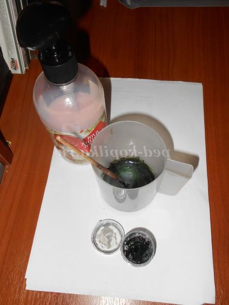 1.У стаканчику для води змішуємо невелику кількість вибраної фарби та рідкого мила.