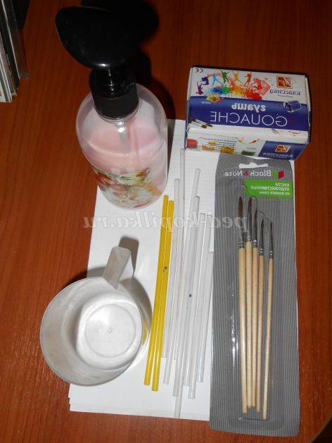 фарби гуаш різних кольорів,стаканчик для води,пензлик,рідке мило,трубочка для соку або коктейлю,альбомні аркуші.