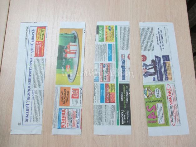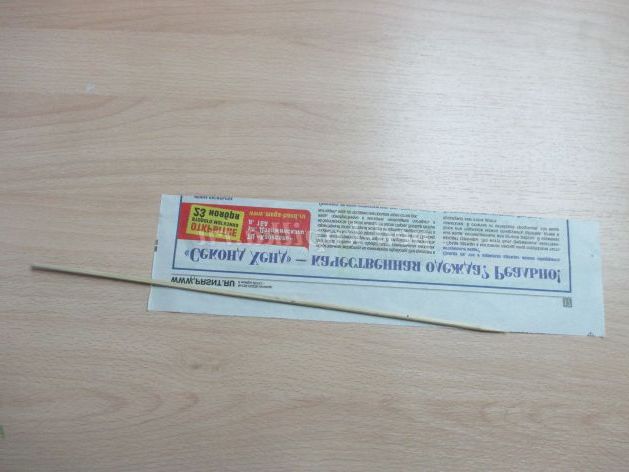 2. Беремо 1 частина газети шпажку пристосовуємо з правого боку під кутом 30-25градусов.Скручиваем, куточок і змащуємо клеем.Один край повинен бути більш розширений,ніж другой.Трубочки повинні бути однакової ширини.