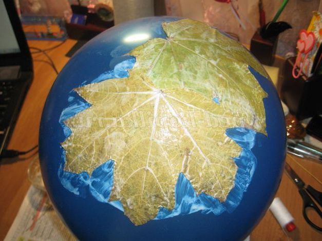 6. Наносимо на кульку клей і приклеюємо листочки по колу, не забуваючи покривати листя клеєм зверху.