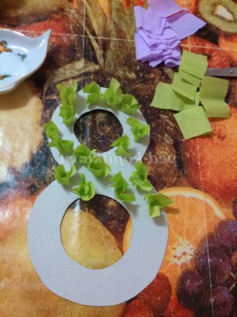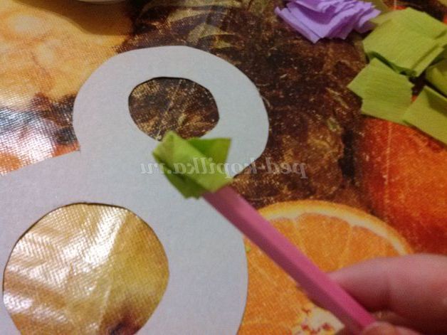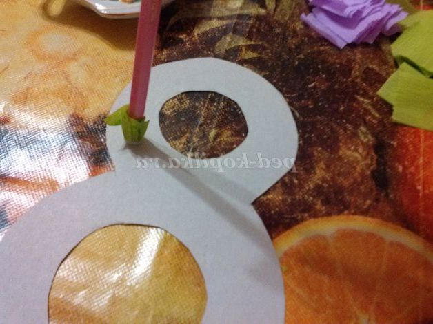 6. На початку я працювала з верхньою частиною вісімки і приклеювала зелену папір, яка передбачає-пелюстки.