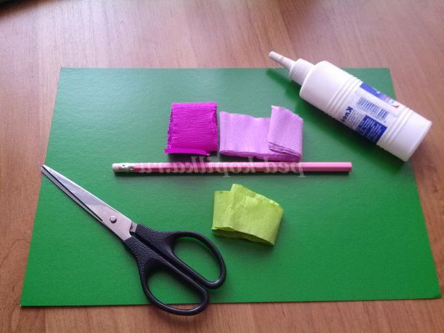 ДЛЯ РОБОТИ НАМ ЗНАДОБИТЬСЯ : кольоровий аркуш картону, гофрований папір - білого,бузкового, фіолетового кольору; ножиці, клей, простий олівець(новий не поточенный).
