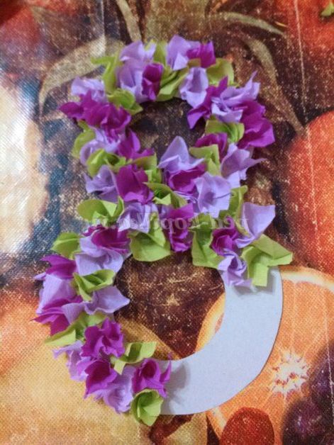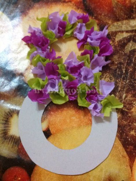 7. Після заповнюємо вільне місце квіточками з гофрованого паперу(вони робляться так само, як і пелюстки).