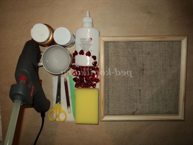 Дерев'яна рамочка (будь-якого розміру) у мене 25/25, полотно або мішковина, клей ПВА, ножиці, стек, паперові серветки( 2-х або 3-х шарові), буси пластикові у вигляді сердечок, чорна акрилова фарба, золота акрилова фарба, пастельний олівець або шматочок мила, склянка з водою, клей-пістолет, губка.