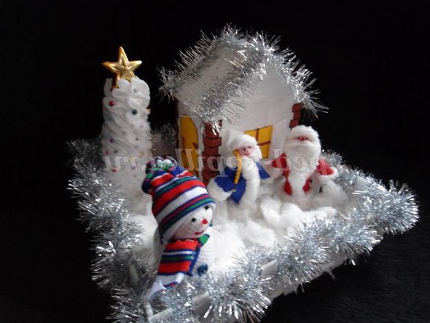На ще одному аркуші стельової плитки формуємо нашу композицію. При бажанні можна із залишків плитки зробити парканчик,прикрасивши її мішурою. Ось такий Чарівний будиночок Діда Мороза у нас вийшов!