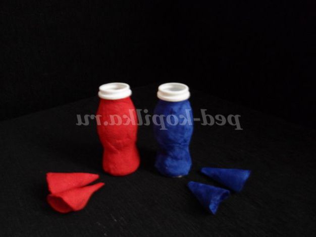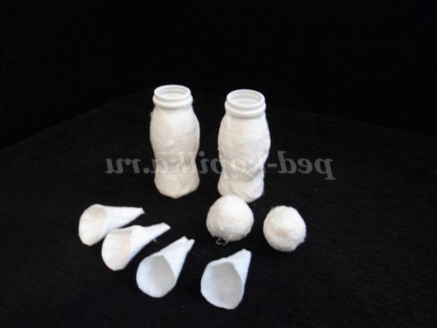 Для виготовлення Діда Мороза і Снігуроньки, беремо 2 баночки від йогурту для основи, і ватні диски для обклеивания. Варимо клейстер,мачає ватні диски в клейстер і обклеюємо баночки, з 4 ватяних дисків формуємо конуси і так само просочуємо їх клейстером(майбутні рукава Дід Мороза і Снігуроньки), а з 2 ватних кульок формуємо голови,обмазуємо їх так само клейстером.Оставляем на добу до повного висихання.