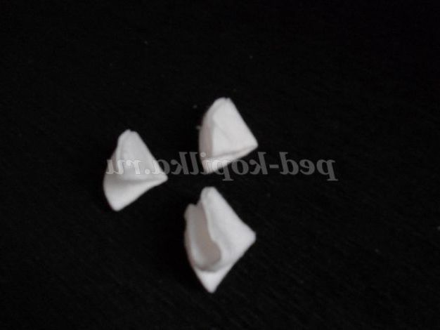 Почнемо створення композиції з виготовлення ялинки. Для цього кожен ватний диск складаємо навпіл і ще раз навпіл, повинні вийти трикутнички, щоб вони трималися склеюємо їх клеєм ПВА чи можна зчепити ниткою.