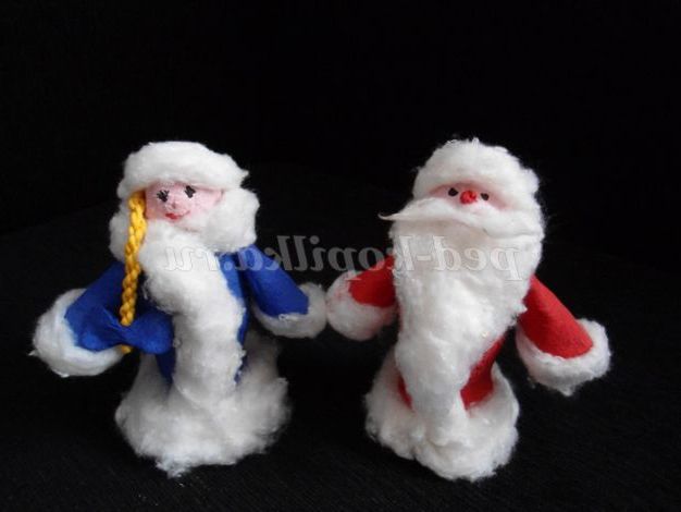 Обклеюємо, за допомогою клею пва, ватою шубки, бороду Діда Мороза, шапочки. Дід Мороз і Снігуронька готові!