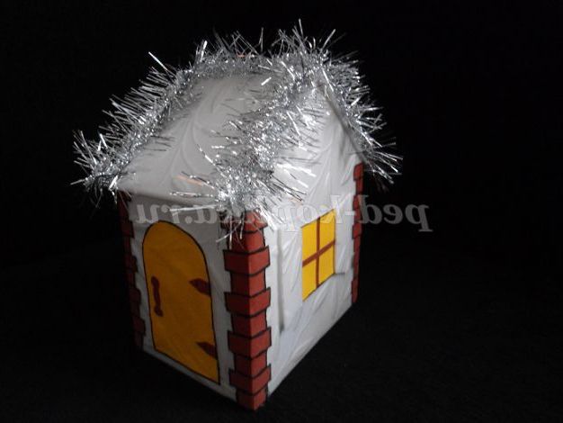 Клеєм ПВА приклеюємо дах; віконце і двері, вирізані з кольорового бумаги.Украшаем будинок мішурою.