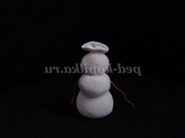 Для виготовлення сніговика наповнимо білий носок крупою , і формуючи кулі перев'язуємо нитками,в середній куля наскрізь вставляємо дріт (це руки сніговика).