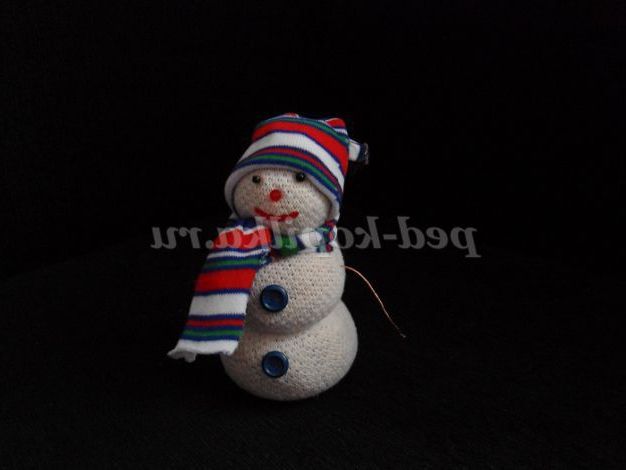 За допомогою намистин робимо очі і носик, шапочку і шарфик вирізаємо з різнобарвного носка.Славный виходить сніговичок!