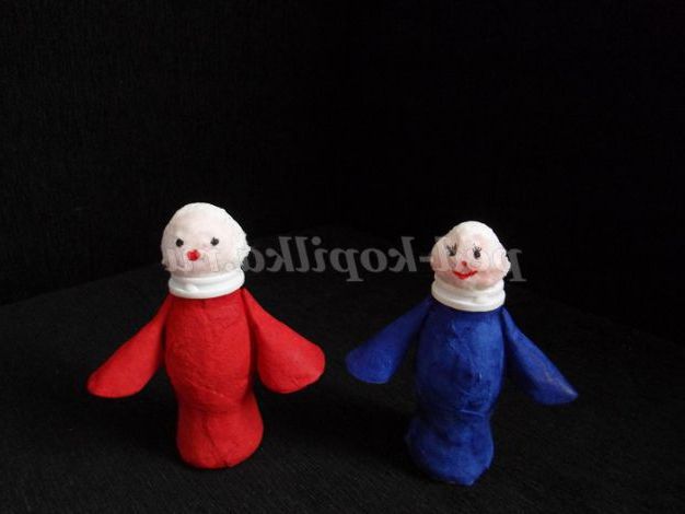 З допомогою клею ПВА приклеюємо рукави і голови,малюємо очі, ніс і рот.