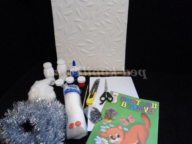 Для виготовлення нам знадобиться: ватні диски, картон, гуаш, вата, пензлик, лінійка, стельова плитка, клей ПВА, кольоровий папір, білий носок, кольоровий носок, крупа (будь-яка,для набивання сніговика), шматочок дроту, пляшечки від йогурту, намистинки і мішура для декорування.